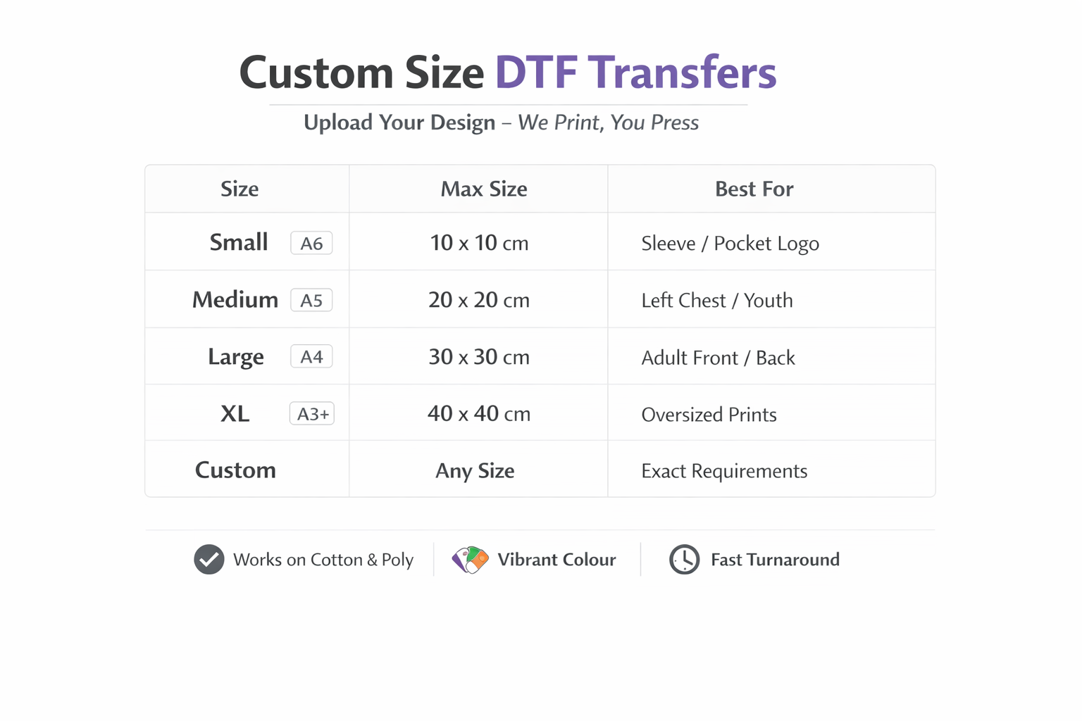 Size chart from Small (A6) to XL (A3+) – Upload Your Design, We Print, You Press